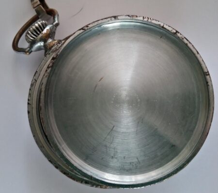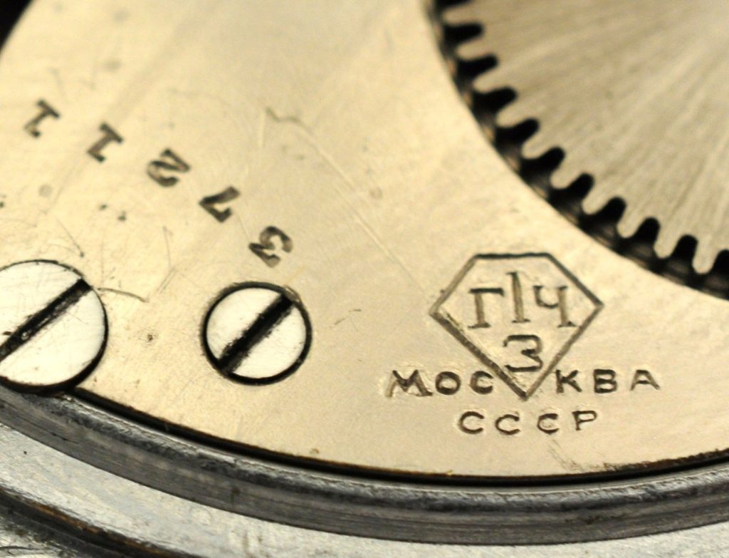 Gravure sur le fond : à l’extérieur, une frise de feuillage ; à l’intérieur, le logo du Gostrust Tochmekh (outils croisés) avec inscrit : 1 Гос Час Завод – Москва – CCCP (le fond est antérieur à 1936).