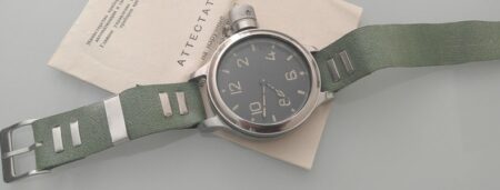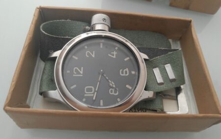 État neuf avec document, boîte en carton et bracelet en caoutchouc vert d’origine (+ un bracelet de cuir artisanal sur mesure).