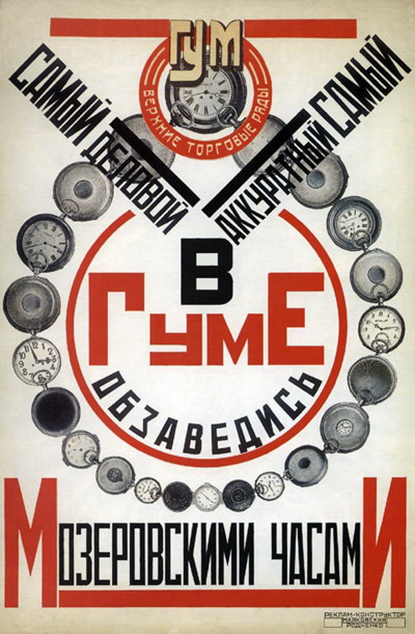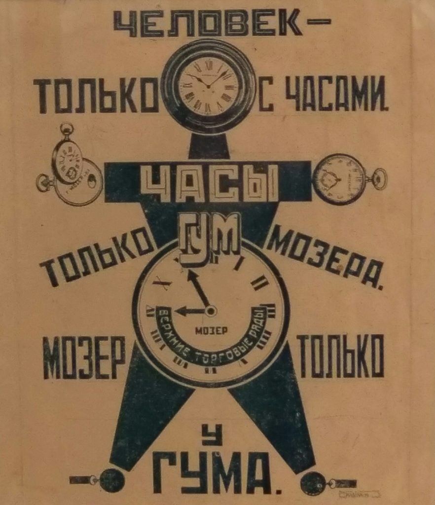 En 1923, Rodchenko et Maïakovski réalisent l’affiche pour la vente des montres Moser au GOuM (Государственный универсальный магазин, Magasin principal universel).