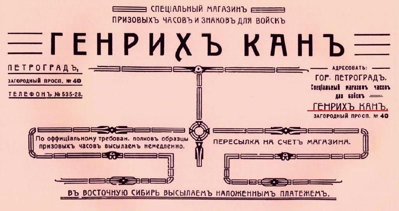 Heinrich Kahn (Генрихъ Канъ) avait une entreprise prospère et très appréciée à Saint-Pétersbourg, une des principales maisons de commerce horlogères de l’Empire russe et fournisseur à la Garde impériale de montres, médailles et souvenirs. Il y a des montres de poche portant son nom avec une orthographe cyrillique ou latine. Le nom d’Heinrich Kann a des origines allemandes et a été écrit Kahn avant 1917. Heinrich Kann lui-même était un artisan remarquable, avec une profonde compréhension de l’horlogerie.