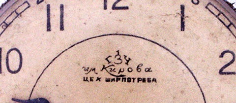 A partir de 1935, la fabrique prend le nom de Kirov (1-го Государственный Часовой Завод им Кирова, 1ère Fabrique de Montres d’Etat du nom de Kirov) et le marquage classique des K43 de la 1FMM est 1 ГЧЗ им Кирова (pour 1-го московского часового завода им Кирова) sous cette forme stylisée: