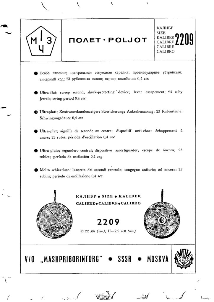 En 1961, le Ministère soviétique de l’Industrie commande la conception d’une montre très plate avec une épaisseur du mouvement inférieure à 3 mm. La 1ère Fabrique de Montres de Moscou créé alors le mouvement 2209.