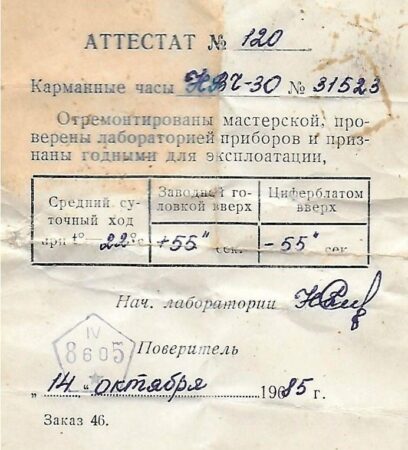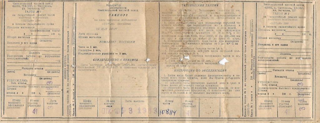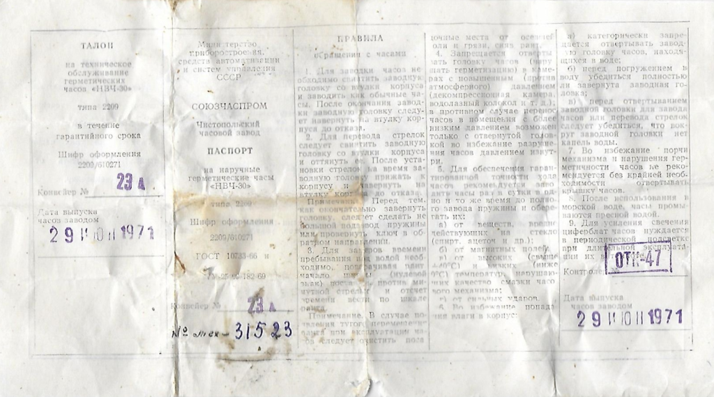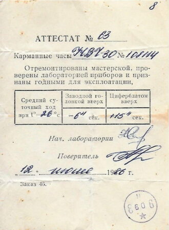 Des passeport ont été délivrés avec toutes les montres Vostok de l’ère soviétique, qu’elles soient destinées à un usage militaire ou civil. En plus de fournir des instructions sur la manière d’utiliser correctement la montre, les passeports sont d’une valeur inestimable pour la datation des exemplaires correspondants. Le « numéro de la montre » ou le « numéro du mécanisme » figurant sur un passeport donné doit correspondre soit au numéro figurant sur le mouvement de la montre, sous le balancier (pour les modèles anciens), soit au numéro estampillé sur le fond de la montre (pour les modèles plus récents). Les multiples marques de date peuvent sembler superflues, mais chaque extrémité du certificat comporte un coupon qui peut être coupé avec des ciseaux et renvoyé avec la montre pour un entretien ou une réparation.