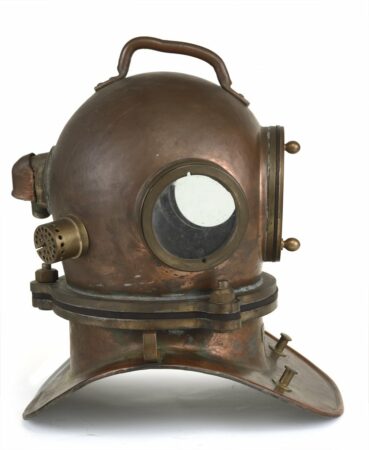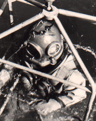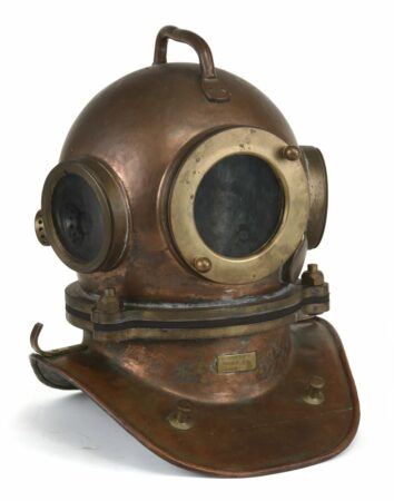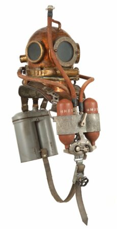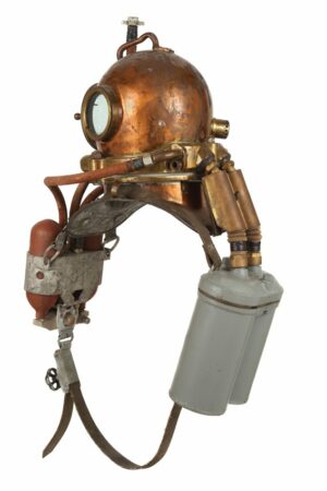 On peut déduire de cette déclaration que l’objectif initial de l’utilisation de la montre lors des plongées en eaux profondes a changé. Les plongeurs de la marine de l’époque utilisaient déjà des systèmes de communication par téléphone et étaient donc moins dépendants des montres pour le chronométrage. La photo ci-dessous montre le casque UVS50 pour la plongée jusqu’à 60 mètres de profondeur. On voit également le système GKS3m qui utilisait un mélange d’hélium et d’oxygène pour atteindre des profondeurs de 200 mètres et, en de rares occasions, de 300 mètres. [Avec l’aimable autorisation de David Dekker : www.divescrap.com]