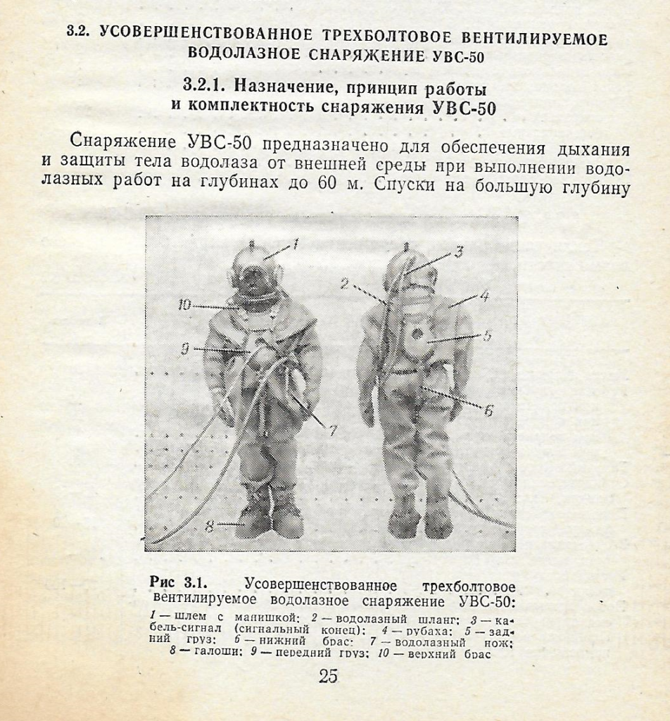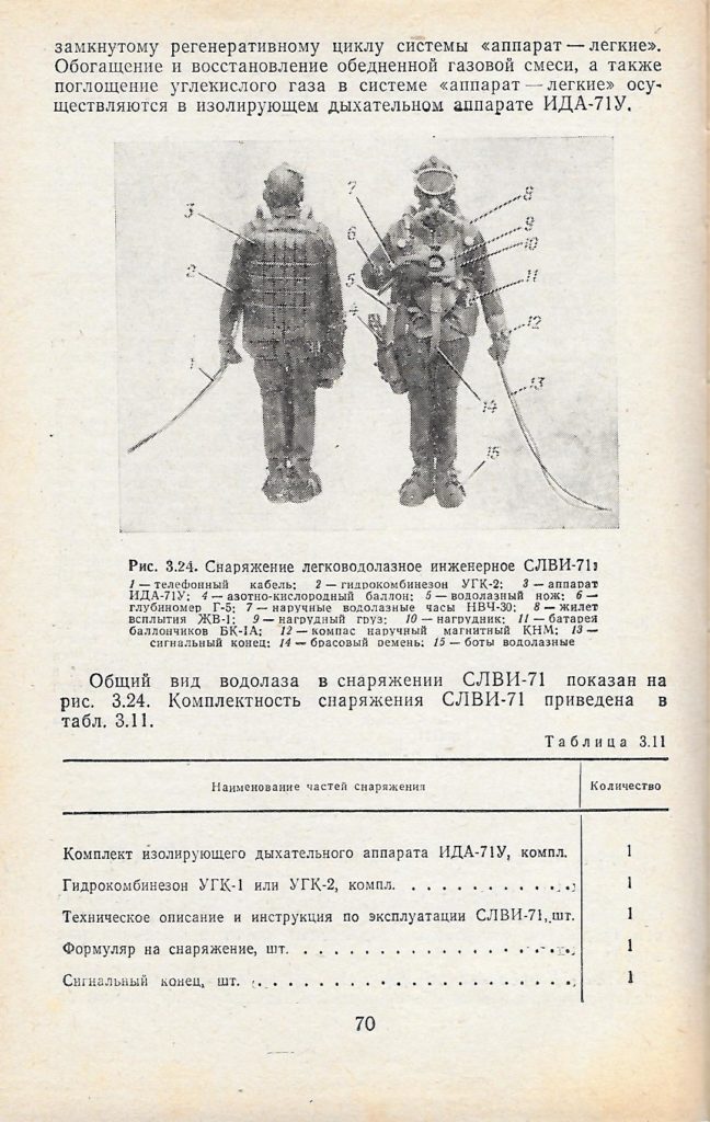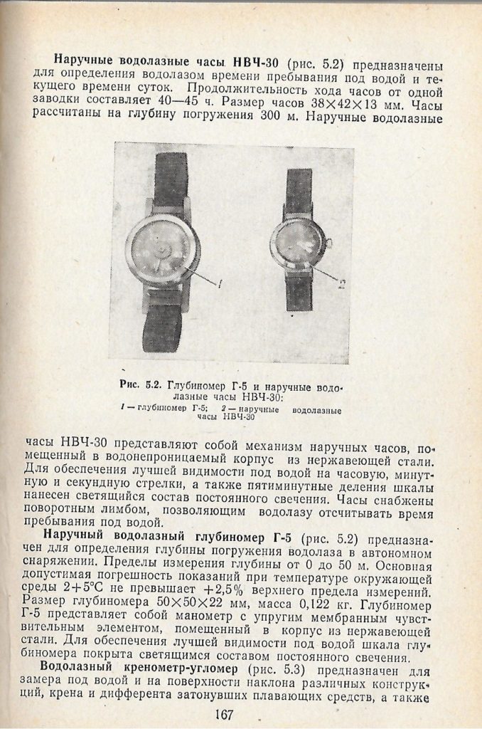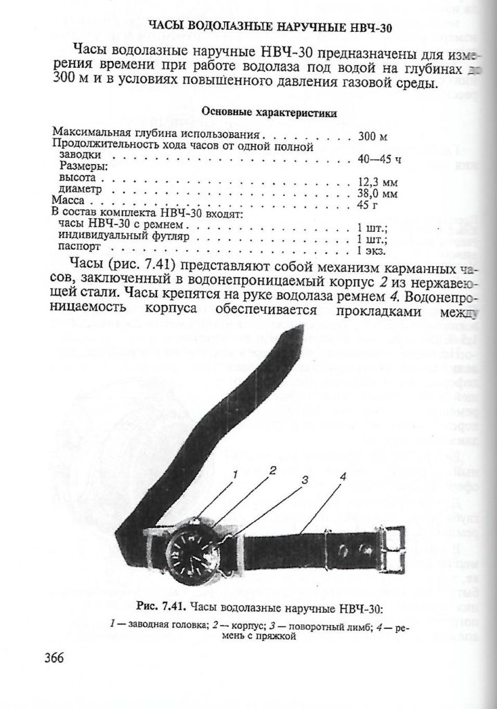 Les pages 70 et 167 font référence à la montre НВЧ-30. Dans le diagramme ci-dessous, un НВЧ-30 se trouve sur le poignet droit du plongeur, indiqué par le chiffre 7. Le plongeur représenté possède un ombilical de communication, des bottes lestées et un recycleur IDA-71. Le même équipement était utilisé par les plongeurs de combat Spetsnaz et PDSS.