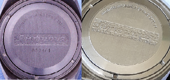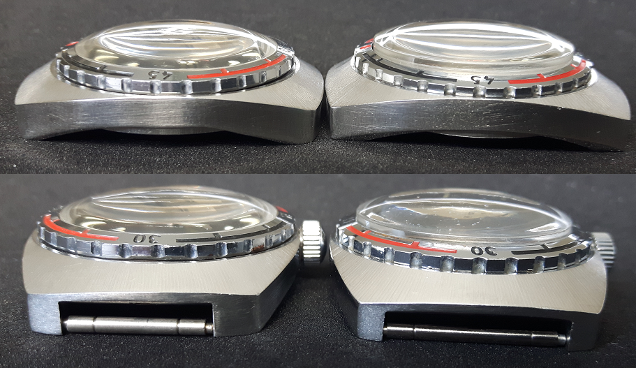 La deuxième génération de НВЧ-30 est certainement le sous-type le plus courant, et il existe des différences subtiles entre les boîtiers au cours du long cycle de production. En règle générale, le profil latéral des boîtiers 300m est légèrement plus épais que celui des boîtiers civils, avec un profil en arc lisse et une zone plate minimale. Dans la comparaison qui suite, la НВЧ-30 est à droite, tandis qu’une montre civile est à gauche.