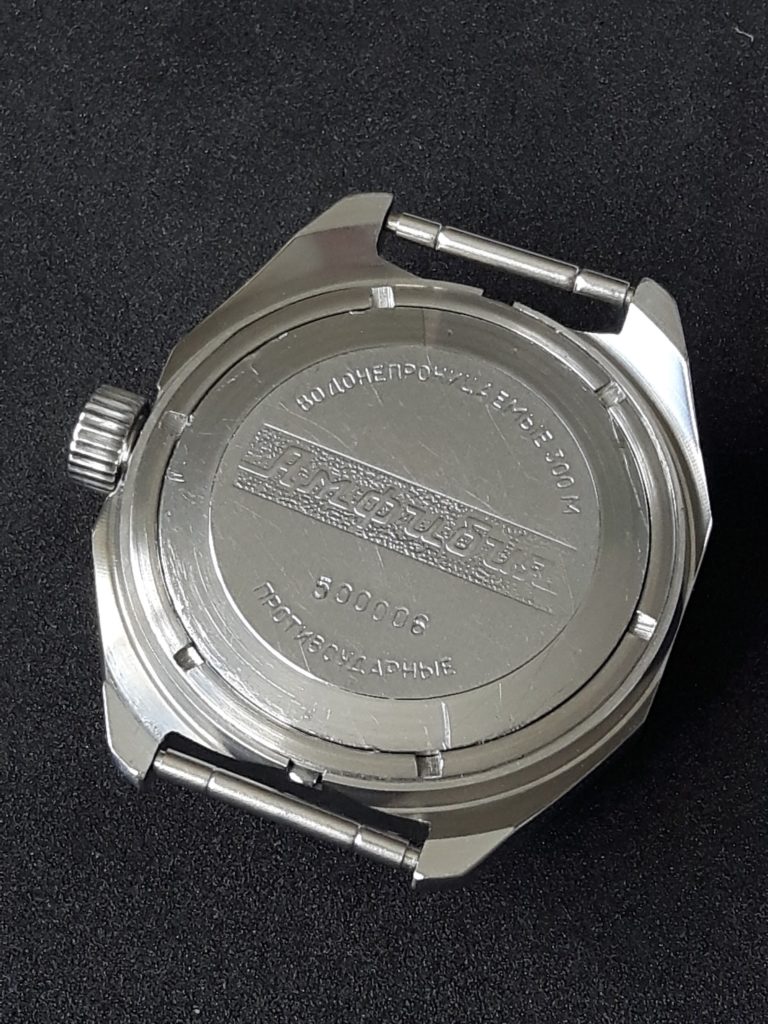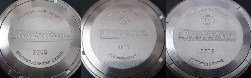 Les dos des boîtiers de la première génération étaient disponibles en trois modèles légèrement différents (voir ci-dessous). Tous présentaient une mention similaire : Пылевлагозащищенные 30 ATM (« étanche à 30 atmosphères »), 2209 (le calibre) et Противоударные бaлaнз (« mouvement antichoc »). Un anneau de lunette directionnel avec des index de cinq minutes permettait aux utilisateurs de calculer les temps de plongée et/ou la consommation d’air. Le cadran stérile est lui aussi resté pratiquement inchangé tout au long de la production de la montre : indices luminescents toutes les cinq minutes, nom de la marque Vostok, nombre de rubis (18, plus tard 17) et « Made in CCCP ».
