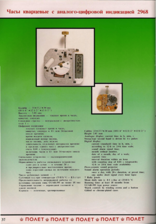 Mécanisme à quartz de la 1ère Fabrique de Montres de MoscouDimension: 23 X 27,7mmAffichage analogique et digitalAlarme sonore7 rubisVariation d’environ seconde par jourAnnées ’90