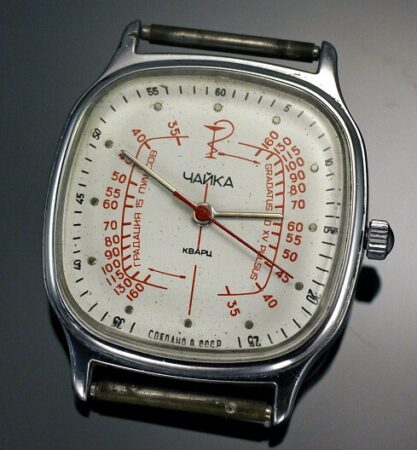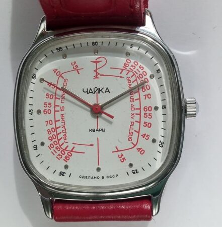 Cette Tchaïka des années ’80 est dite « médicale » parce qu’elle porte un pulsomètre imprimé sur le cadran (à gauche en cyrillique, à droite en caractères latins).