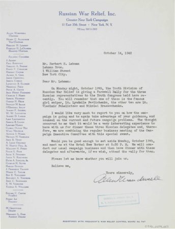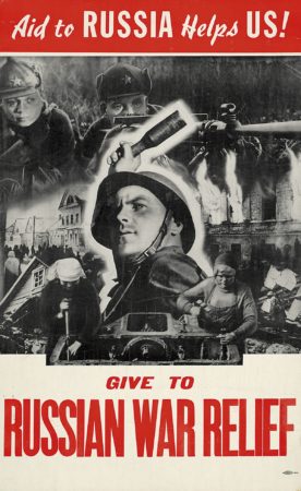Le 29 juillet 1941, un mois après l’attaque allemande contre l’URSS, un groupe se réunit à New York et fonde le 12 septembre 1941, la Russian War Relief (« Aide à la Russie dans la guerre »). La Russian War Relief (également connu sous le nom de Russian War Relief Fund, ou d’American Committee for Russian War Relief) était la plus grande société américaine d’aide à la guerre. Elle avait « pour objectif exprès et exclusif de secourir le peuple russe en temps de crise ». Plus de 500 personnalités américaines ont soutenu la création de la Russian War Relief : Eleanor Roosevelt, l’épouse du président des États-Unis, Albert Einstein, Charlie Chaplin, Leon Feuchtwanger, Robert Oppenheimer, John von Neumann et d’autres en sont devenus membres honoraires.