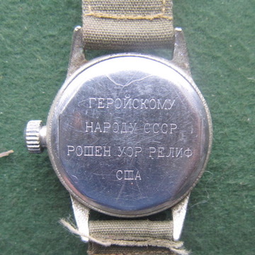 La Russian War Relief a ainsi commandé des montres pour les militaires soviétiques aux grandes compagnies horlogères américaines Waltham, Elgin et Hamilton. Ces montres ont été fabriquées conformément aux spécifications de l’U.S. Army Ordnance Department, ce qui signifie qu’elles ont été conçues pour des besoins militaires. Ces montres portaient une inscription sur le fond: « Au peuple héroïque de l’URSS – Russian War Relief, Etats-Unis », la première partie en russe, la deuxième partie en translittération cyrillique de l’anglais. C’est ainsi que les équipes médicales russes ont reçu des montres militaires Hamilton emboîtant des mouvements 987a. Au total, 31.557 montres auraient été achetées, pour le montant de 300.000 dollars, et envoyées en URSS.