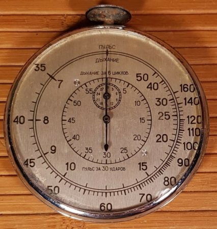 1° par leur cadran spécialement gradué pour mesurer le rythme cardiaque. On y lit les mentions пульс за 30 ударов (poul pendant 30 battements) en rouge sur l’index extérieur, дыхание за 6 циклов (respirations pendant 6 cycles) en noir sur l’index du milieu. L’index des secondes au centre est marqué du logo Agat