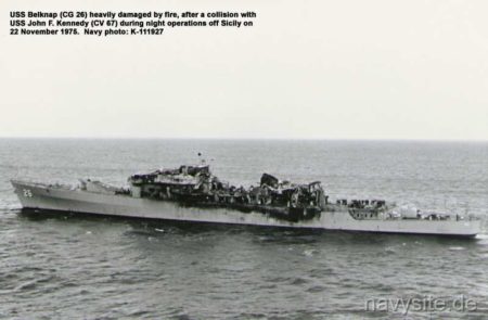 En 1976, le Belknap a été victime d’une terrible collision avec le porte-avion John F. Kennedy. Au large de la Sicile. La superstructure du « Belknap » étant en aluminium et non en acier, elle a littéralement fondu dans l’incendie qui a suivi la collision. 7 marins du « Belknap » (et un du « Kennedy ») ont été tués dans la catastrophe.