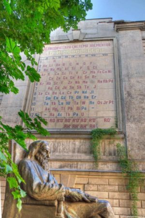 En 1935, un monument grandiose a été érigé sur le mur près de VNIIM – le tableau du tableau périodique des éléments chimiques de Mendeléev. Les éléments découverts au cours de la vie de Mendeléev sont indiqués dans le tableau en rouge, et de 1907 à 1934 – en bleu.