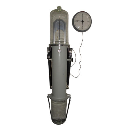 Le pendule à impulsion électronique oscille avec une période de 2 secondes à l’intérieur d’une cloche en verre épais contenant un vide presque total.