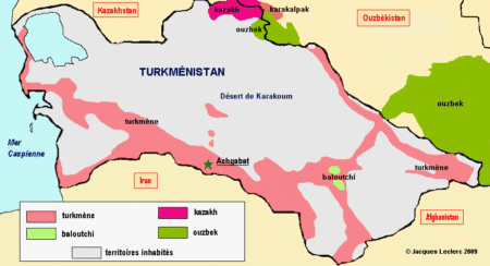 Après 1926, l’alphabet latin proche de celui adopté par la Turquie de Mustapha Kemal Atatürk remplaça l’alphabet arabe dans la transcription du turkmène. Puis, dans les années quarante, c’est le cyrillique qui s’impose à la langue turkmène. Le 6 octobre 1948, un très violent séisme tua plus de 176.000 personnes à Achkabad, soit les deux tiers de la population de la ville qui fut presque totalement rasée – puis reconstruite.