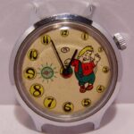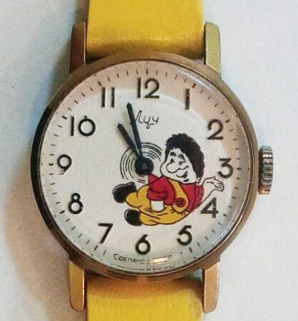 Karlsson est un héros de la littérature pour enfant de la romancière suédoise Astrid Lindgren. Il était populaire en URSS et plus encore quand il a fait l’objet d’adaptation en cinéma d »animation. Il illustre le cadran de plusieurs montres pour enfant produites en URSS.