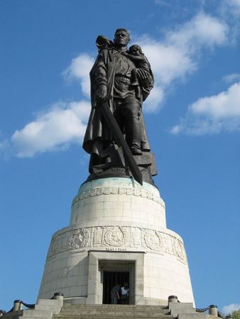 C’est une statue en bronze d’un soldat de l’Armée rouge qui porte un enfant sur un bras, pointe le sol de son épée et foule de son pied une croix gammée brisée. Elle rappelle le geste d’un soldat soviétique qui a risqué sa vie pour sauver celle d’une fillette allemande prise sous le feu lors de la bataille de Berlin, le choix de ce symbole porte ce message: l’armée soviétique est venue écraser les nazis et non le peuple allemand.