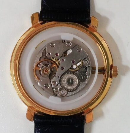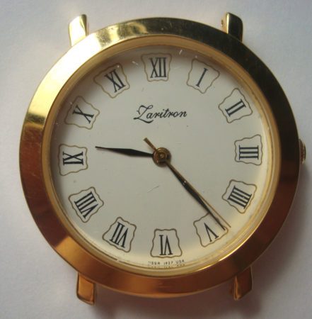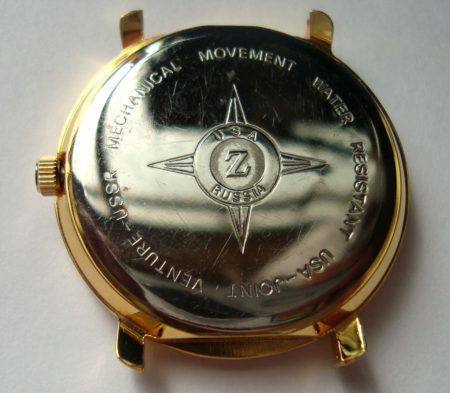 Gravure sur le fond : le logo Zaritron (rose des vents marquée « USA/Z/RUSSIA ») et la mention: « Mechanical movement Water resistant USA-joint venture-USSR »