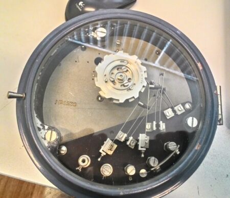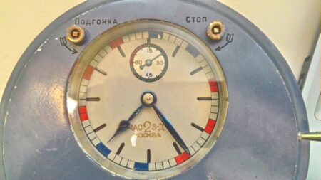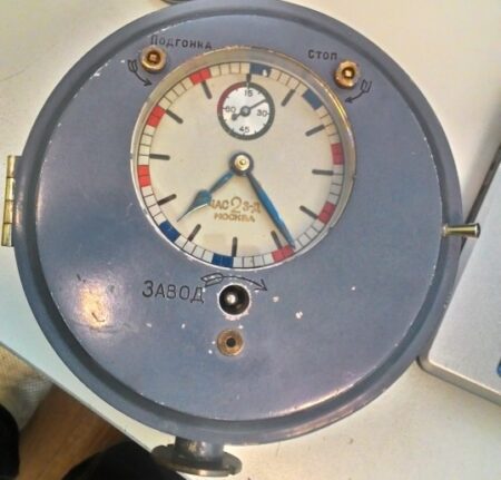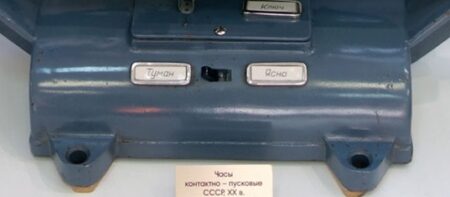 C’est pour cela que cette horloge à un interrupteur qui permet à l’opérateur de choisir deux fonctions selon conditions météorologiques (sur la base du support): à gauche sur « Туман » (brouillard) si la visibilité dans la zone du phare est devenue inférieure à 7 miles, à droite sur « Ясно » (temps clair) dans le cas contraire.