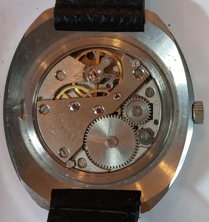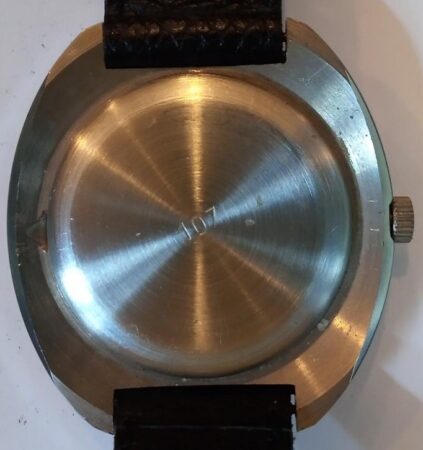 Le modèle a été produit avec le mouvement de 24 heures 2623.N, mais cet exemplaire emboîte le classique Raketa 2609.NA 12 heures. Objet typique de la pire époque de la Fabrique Raketa.