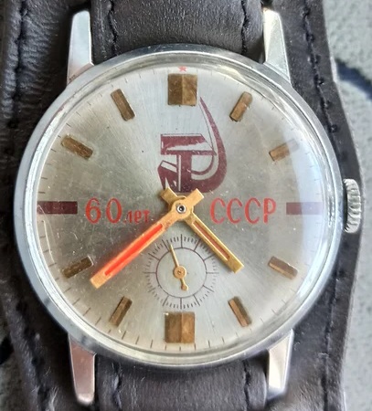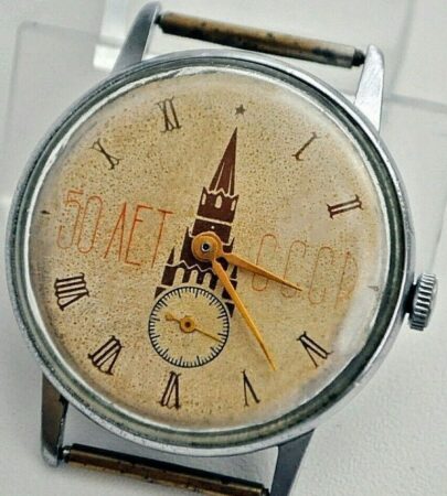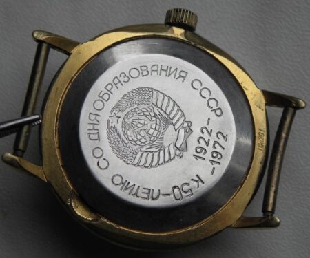 Le marquage commémoratif est parfois sur le fond comme sur cette Poljot de 1972 dont le fond célébre les 50 ans de la fondation de l’URSS: