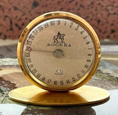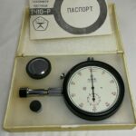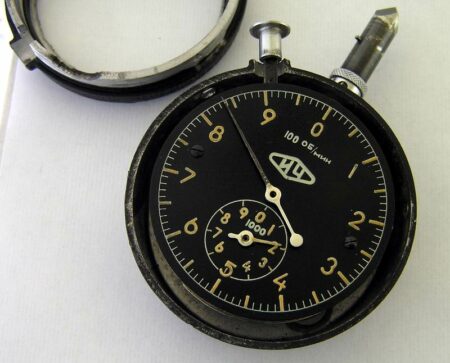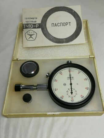 Tachymètre de type ТЧ-10Р (ТЧ pour Тахометр часовой, montre ou horloge tachymètre) a été massivement produit par la Fabrique de Montres de Tchistopol. Il est destiné à mesurer avec précision la vitesse de rotation de pièces de machines et de mécanismes d’une fréquence de fréquence de rotation de 50 à 1000 et de 1000 à 10000 tours/minute à des vitesses linéaires de 10 à 100 et de 100 à 1000 m/minute. En savoir plus sur cet objet