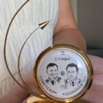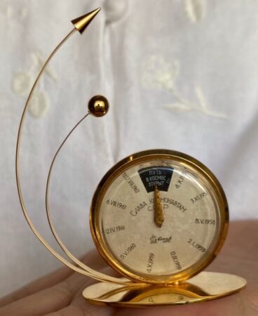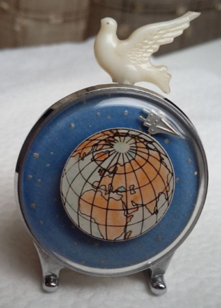 Ce souvenir est basé sur un mécanisme « Pobeda » dans lequel seule l’aiguille des minutes est utilisées pour faire tourner la fusée autour du globe (celui-ci en simple papier imprimé). La colombe de la pais est en plastique.
