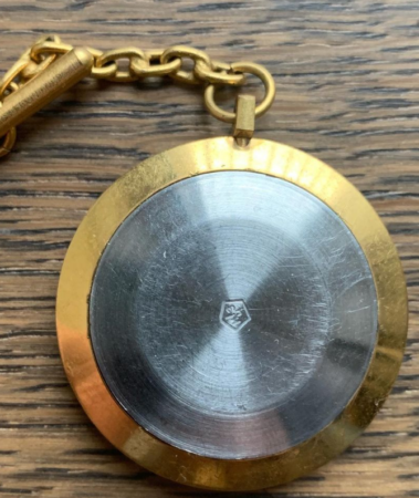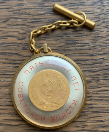 Cette chaînette commémore les 50 ans de pouvoir soviétique. Elle a été fabriquée par la 1ère Fabrique de Montres de Moscou dont elle porte la marque au dos.