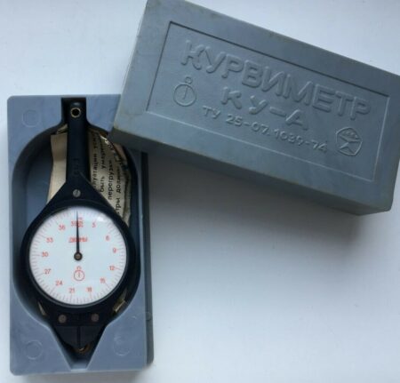 Le curvimètre de type KY-A possède deux cadrans de part et d’autre. Un noir gradué en centimètres et portant CM, un rouge, est en graduée pouce et est marquée дюймы (pouces…). En savoir plus sur cet objet