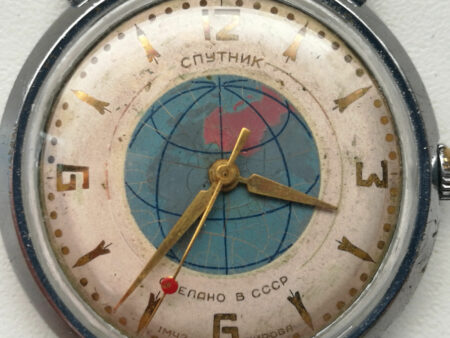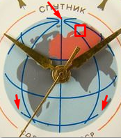 Sur le cadran figure un globe terrestre avec, en rose, l’URSS. Le satellite est figuré par un petit cercle rouge au bout de la trotteuse: il fait ainsi le tour de la terre! Détail supplémentaire: l’index des heures fait de petites fusées.