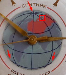 Sur les Spoutnik de Tchistopol, l’aiguilles des petites secondes est remplacée par un disque. Y figurent une portion du globe terrestre et le satellite. Celui a un disque percé en son centre qui indique en tournant les secondes.