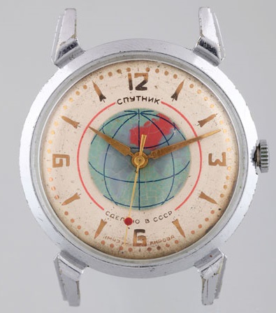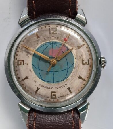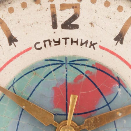Sur le cadran figure un planisphère sur laquelle l’URSS est en rouge (devenu rose avec le temps…). La trotteuse a un petite disque rouge figurant le Spoutnik et tournant autour du globe. L’index est composé de petites fusées dorées.