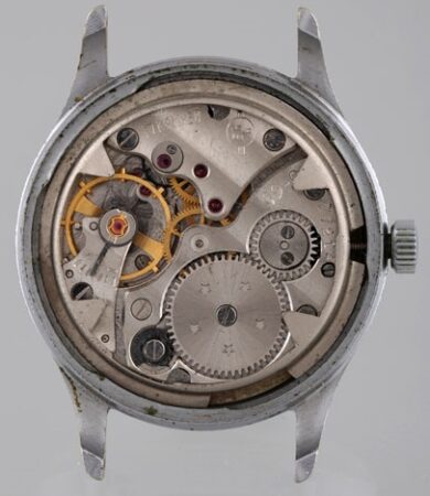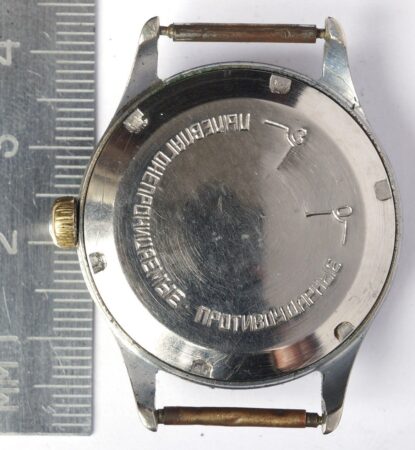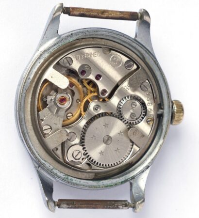 Mentions sur le calibre : n° de série (03860) sur un pont et 4-58 (millésime) sur un pont, premier logo de la fabrique de Tchistopol (initiales ччз dans une cercle flanqué part et d’autre de triple-traits) et 17 камня (17 rubis) sur un autre, cinq étoiles sur le rochet. Côtes de Genève.