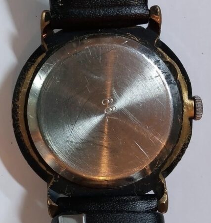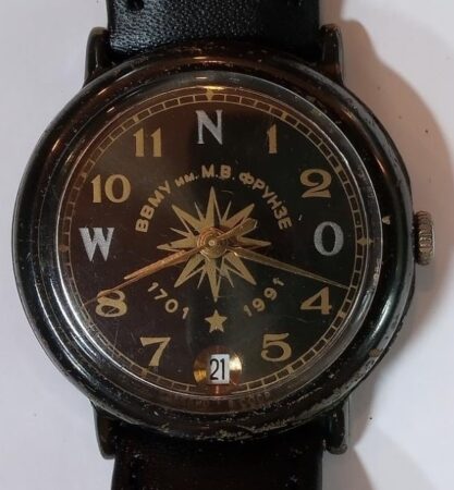 Motif du cadran : Rose des vents dorée, les points cardinaux N O W en blanc, et la mention en doré : 1701-1991 ВВМУ им М. В.ФРУНЗЕ (pour М. В. Фрунзе орденами Ленина, Красного Знамени, и Ушаков высшее военно-морское училище : Ecole Supérieure Navale MV Frounzé et Ouchakov, Ordres de Lénine et du Drapeau rouge)