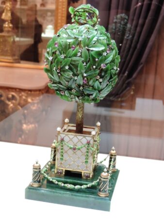 Il a 325 feuilles de néphrite et est parsemé de diamants roses, d’améthystes et de citrines. Un oiseau doré mécanique, décoré de vraies plumes de colibri s’élève du haut de l’arbre, bat des ailes et chante…