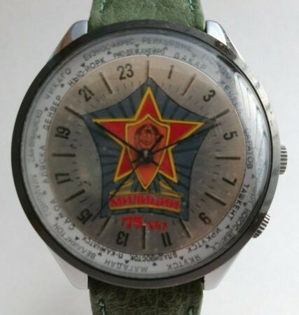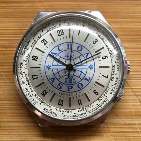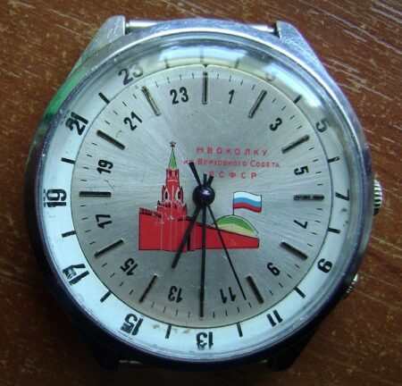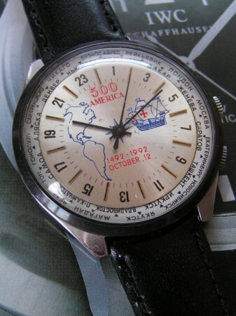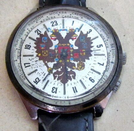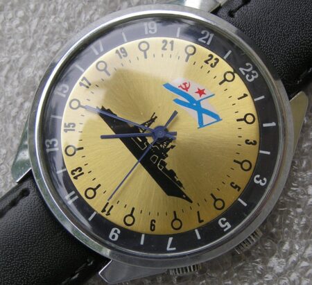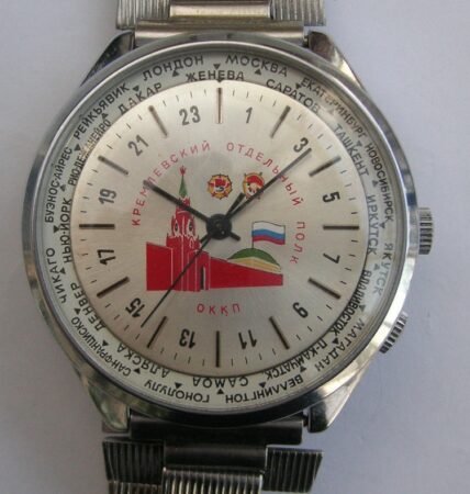 Les montres ci-dessous pourraient être jugées soviétiques (SU estampé sur le mécanisme, « Sverdlovsk » sur la lunette intérieure des World Time, etc.) mais en fait: non. Notons que différentes dates peuvent être retenues pour décréter la fin de l’URSS. La plus communément admise est le 8 décembre 1991 mais avant cela il y a eu la vague des proclamations d’indépendance et une situation de double pouvoir (de triple même au moment du putsch d’août 1990), et ce n’est qu’après cette date que Gorbatchev va démissionner, tandis que la constitution soviétique restera en vigueur jusque fin 1992.