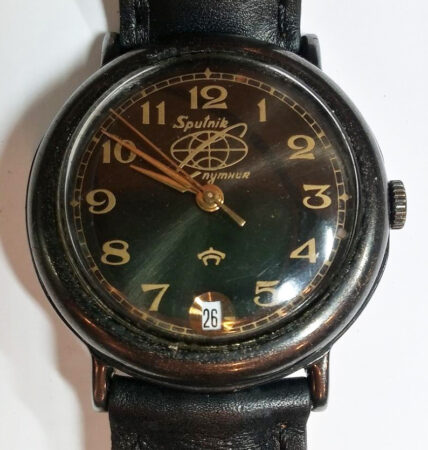 Voir ici une montre de poche Molnija produite pour les 25 ans de l’Agence Spoutnik