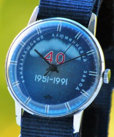 Motif cadran : Aurore boréale blanche sur fond bleu, grand 40 rouge et mention кандалакшский алюминиевый заводanc (pour les 40 ans de la Fabrique d’aluminium de Kandalakcha, la KAZ.