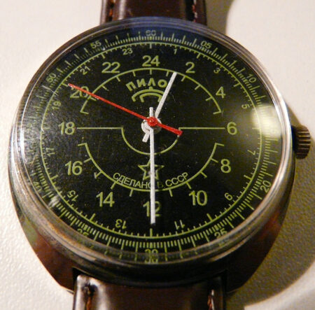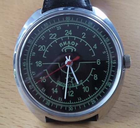 Le cadran de cette Raketa 24 heures de marque « Pilot » l’indique produite en URSS (cделано в cccp) alors qu’elle a été produite bien après la fin de l’URSS. Les premières « Pilot » auraient été fabriquées par un atelier dépendant à l’origine de la 1ère Fabrique de Montre de Moscou, en s’inspirant de la prestigieuse Poljot Aviator-1.