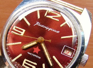 Dans les années 70 et 80, les Komandirskie sont produites pour le ministère de la défense (mention 3AKA3 MO CCCP au bas du cadran). Elle portent portent simplement comme marque, outre la mention Komandirskie, Чистопол (Chistopol).