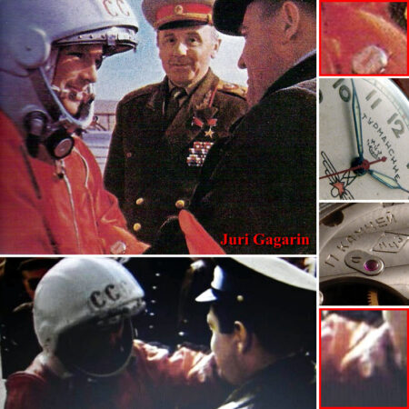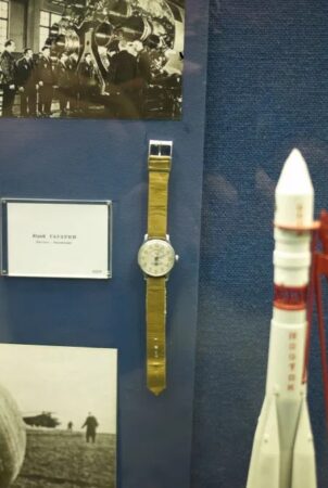 Cette Rodina (la première montre automatique soviétique), montée sur un bracelet en métal, a été offerte à Gagarine par le Commandant des forces aériennes soviétiques après la réussite de la mission Vostok-1.
