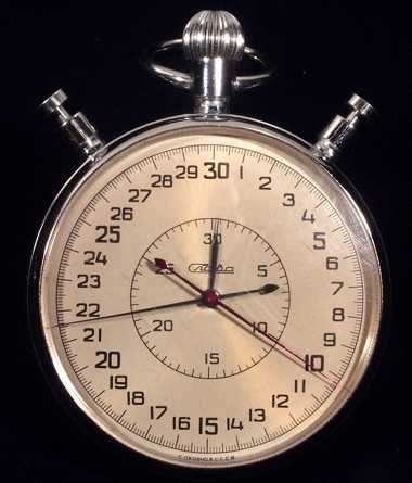 Modèle СДСпр-1-2-000 (pour Секундомер Двухстрелочный, Справочное 1, класс точности 2 – Chronomètre de précision à deux aiguilles, Référence 1, précision de classe 2) de la 2e Fabrique de Montres de Moscou.