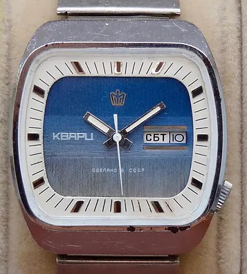 La première montre électrique à apparaître en Union soviétique, vers 1958, était le résultat d’une collaboration entre la Fabrique de Montres de Minsk et l’institut de recherches horlogères Chasprom.