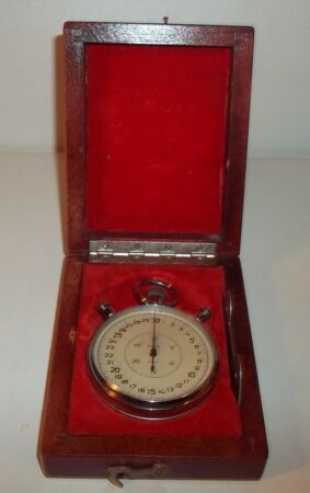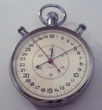 Modèle СДСпр-1-2-000 (pour Секундомер Двухстрелочный, Справочное 1, класс точности 2 – Chronomètre de précision à deux aiguilles, Référence 1, précision de classe 2) de la 2e Fabrique de Montres de Moscou (Второй московский часовой завод), presque toujours produit sous la marque Slava.