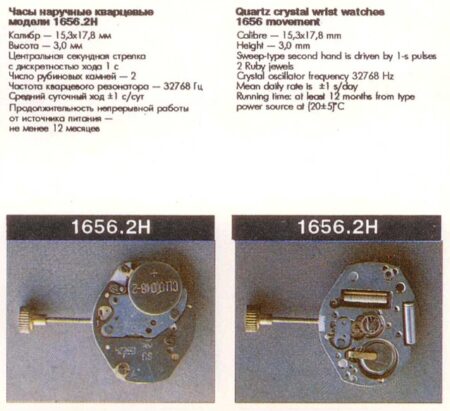 1656.2H Mouvement à quartz à affichage analogique, avec trotteuse, de la 2e Fabrique de Montres de Moscou.Dimensions: 13,3 X 17,8mmHauteur: 3mm2 rubisFréquence: 32.768 HzVariation: plus ou moins une seconde par jourProduit dans les années 90.