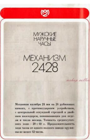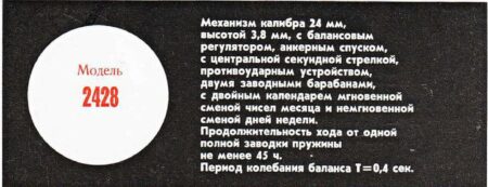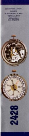 Le 2428 est un mécanisme de la 2e Fabrique de Montres de Moscou qui dérive du 2414 à double barillet (voir ici). Comme le 2414 il indique la date, mais à la différence du 2414, il indique aussi le jour. Il a été produit dans les années ’80 et les années ’90.