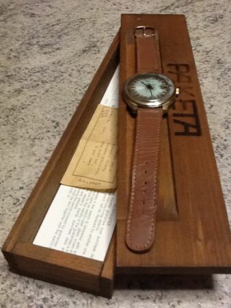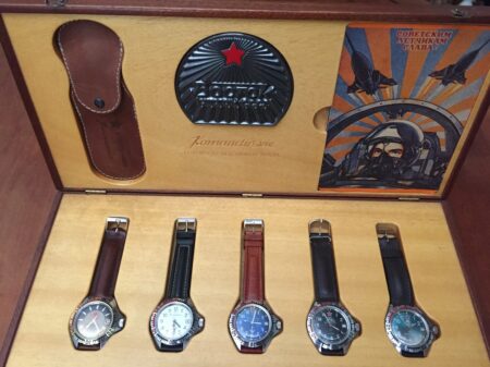 Les montres venaient d’URSS mais bénéficiaient d’un packaging soigné (souvent en bois, ou alors avec les boites rouges à lettrage doré), et de bracelets dédiés (portant la marque et/ou CCCP), voire de pochettes de rangement en cuir, le tout fabriqués en Italie: