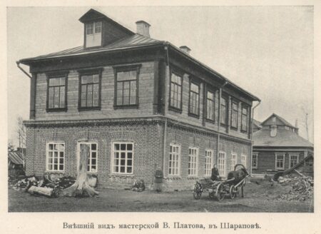 C’est une certain Gerasim Afanasyev qui a ouvert le premier atelier d’horlogerie, en 1875. Mais c’est Vassili Illich Platov qui fut, de loin, le plus grands fabricants d’horloges de Charapovo. Platov construisit une fabrique en brique, alors qu’ailleurs dans le district, on travaillait artisanalement dans des maisons de bois. Il a participé à de grandes foires, notamment celle de Nijni-Novgorod, a reçu des prix pour ses produits. Il avait également un jeune frère Stepan, qui avait sa propre production horlogère, bien que plus petite en volume. En 1906, Platov employait 110 travailleurs dans sa fabrique et 50 travailleurs à domicile, qui produisaient 50.000 horloges par an. Il poursuivit sa croissance et sa concurrence allait provoquer la fermeture de nombreux petits ateliers… dont les patrons et les travailleurs allaient chercher du travail chez Platov.