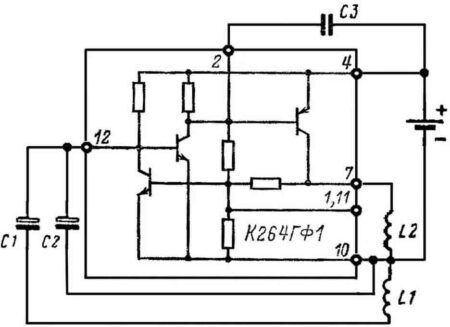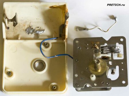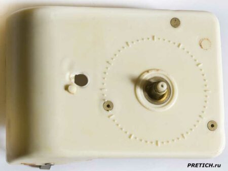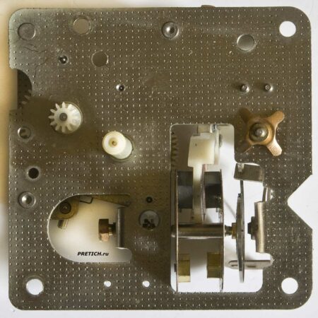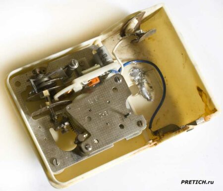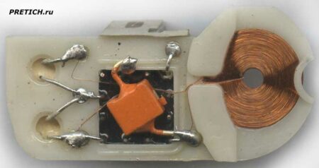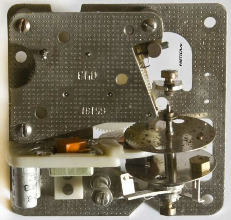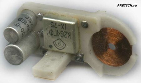 L’unité électronique est montée sur un support en plastique, est très simple : l’inducteur est un électro-aimant. Deux condensateurs électrolytiques K50-6, l’un pour 50 uF 6 volts, l’autre pour 10 uF pour 10 volts. Dans le cas de cet exemplaire, ils ont tous deux ont été fabriqués en 1975 au Dipol PO, la ville de Kamo, RSS d’Arménie. Le microcircuit K264GF1 est en fait un micro-ensemble composé de trois transistors et de cinq résistances – il s’agit d’un générateur de transistors. Le condensateur est de type KLS.